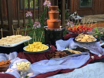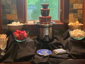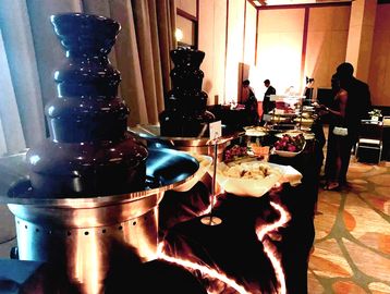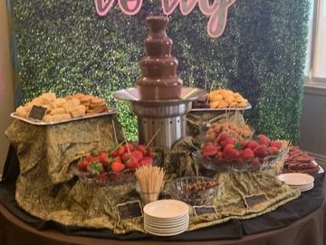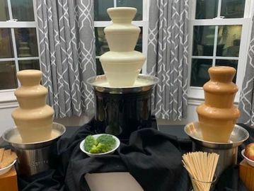 Includes choice of premium chocolate: semi-sweet (standard), milk, or white. Also includes professional display, set up, clean up, skewers, and up to 3 hours of fountain run time. Display includes risers for food trays, covered in yards of fabric and decorated to make your table beautiful.